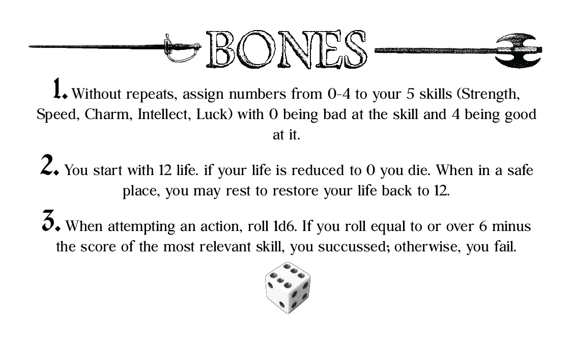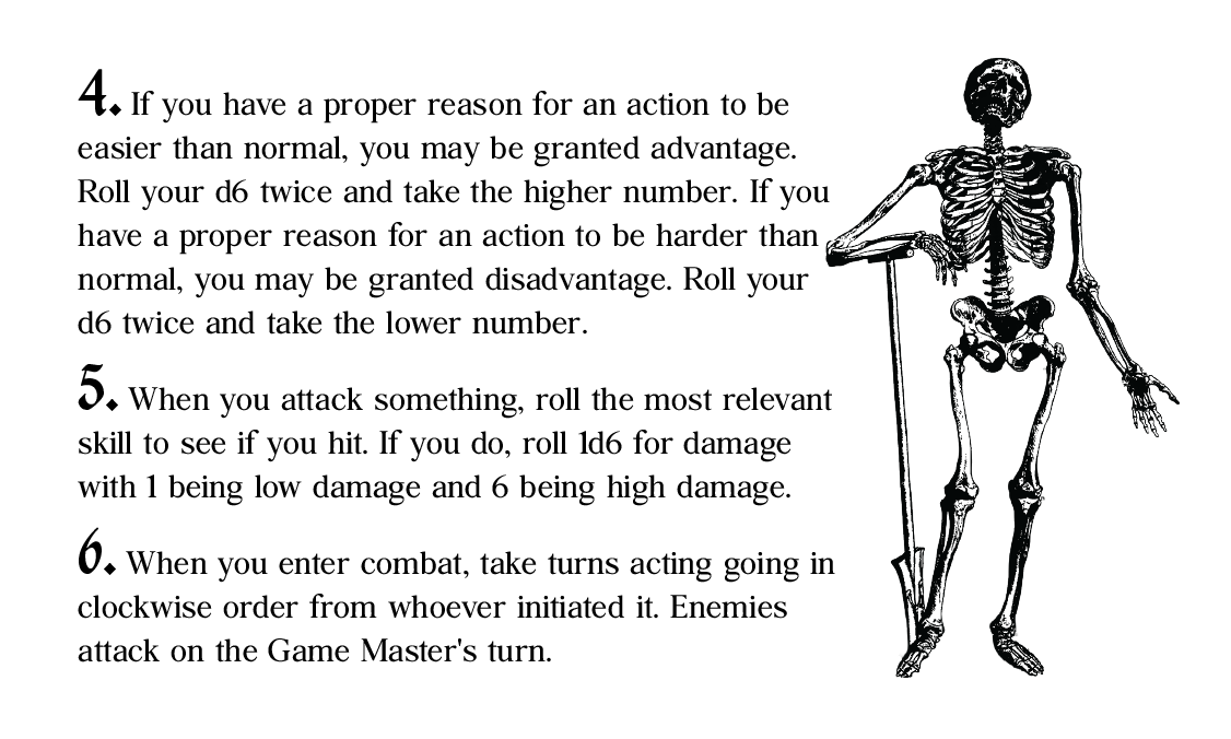 Warning: One side effect of this system being so simple for new players, is its possible difficulty for new games masters. Many aspects of the game are left vague due to the space constraints. My advice, just run it however feels right to you.